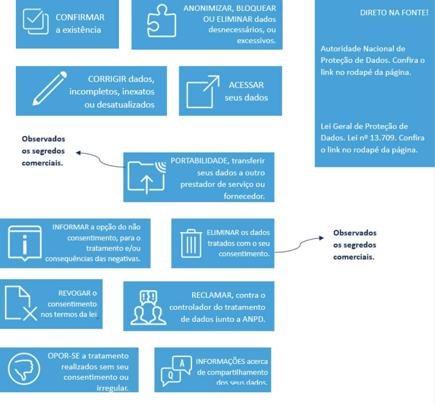 É um direito seu como cidadão e titular dos seus próprios dados ter ciência dos seus direitos, pois isso listamos abaixo os direitos que a Lei 13.709/2018 – Lei Geral Proteção de Dados Pessoais – assegurou ao titular, os quais temos o prazer de lhe possibilitar o exercício desses direitos, estamos a sua disposição.